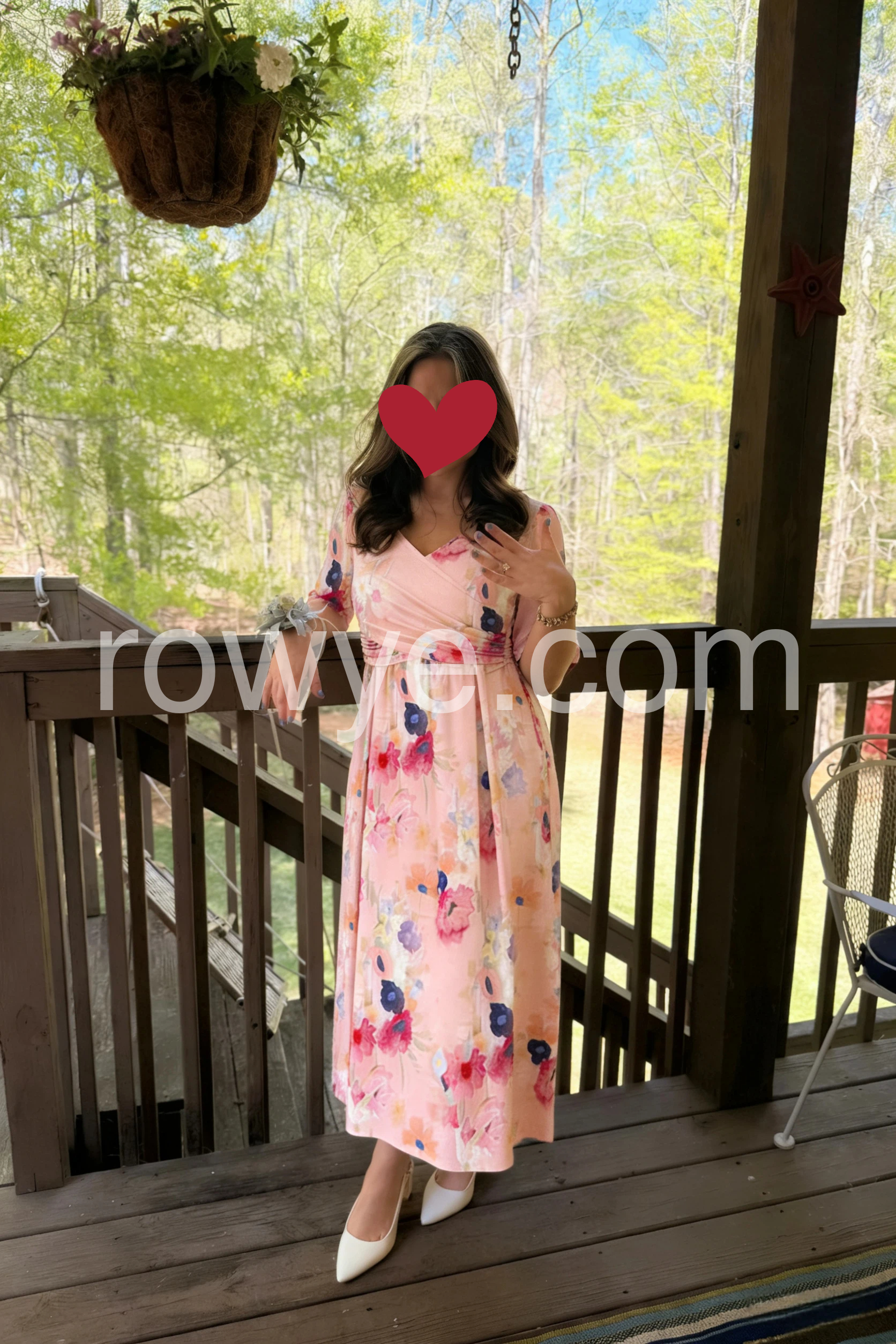This midi dress features a soft pink base with vibrant floral prints. The V-neck and short sleeves offer a feminine touch. Side pockets add practicality and ease. Lightweight fabric perfect for spring or summer days. Ideal for casual outings or garden parties.