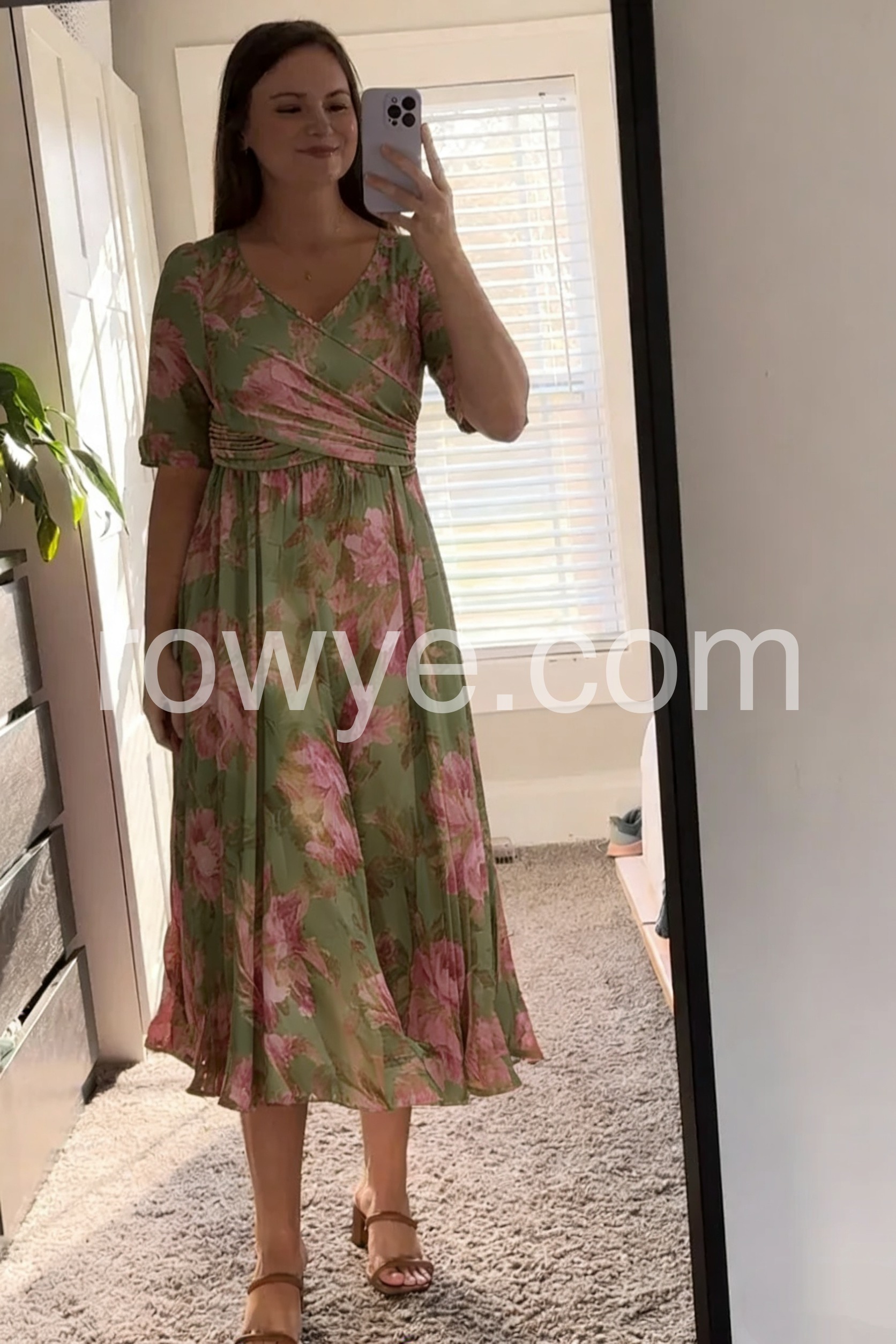 This wrap-style midi dress features a lush green base with soft pink rose prints. The V-neck and short sleeves create a graceful silhouette. Side pockets add comfort and convenience. Lightweight fabric perfect for warm days. Ideal for garden parties or casual outings.