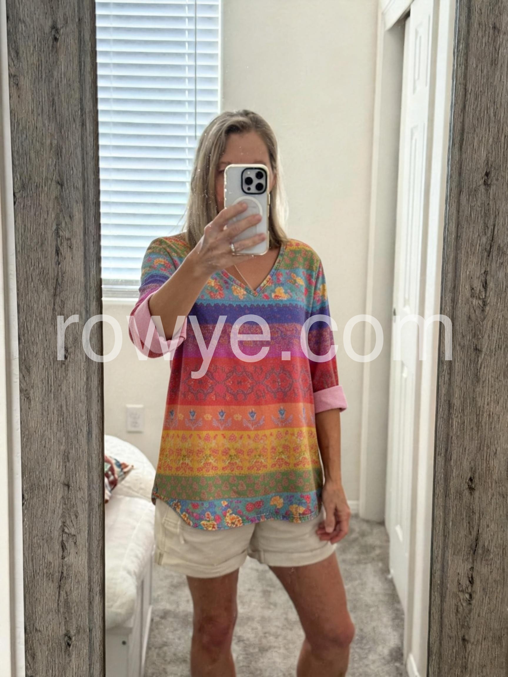 Great casual top! I love that the sleeves can be rolled up to 3/4 length. The colors are beautiful and bright, making it a perfect transition piece from summer to fall.